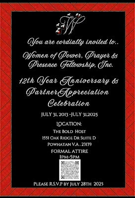 We are excited to announce and invite you and your guest(s) to this time of celebration of Women of Power, Prayer & Presence Fellowship, Inc.'s 12th Year Anniversary & Partner Appreciation Celebration! We will honor our partners as well as our founder and leader, Apostle LaForest Shelley Johnson, on August 16, 2025 from 1 pm - 5 pm. for the years of service ministered, commitment, dedication, and our leader for her leadership. This ministry event is free but registration is required for each attendee due to limited seating.